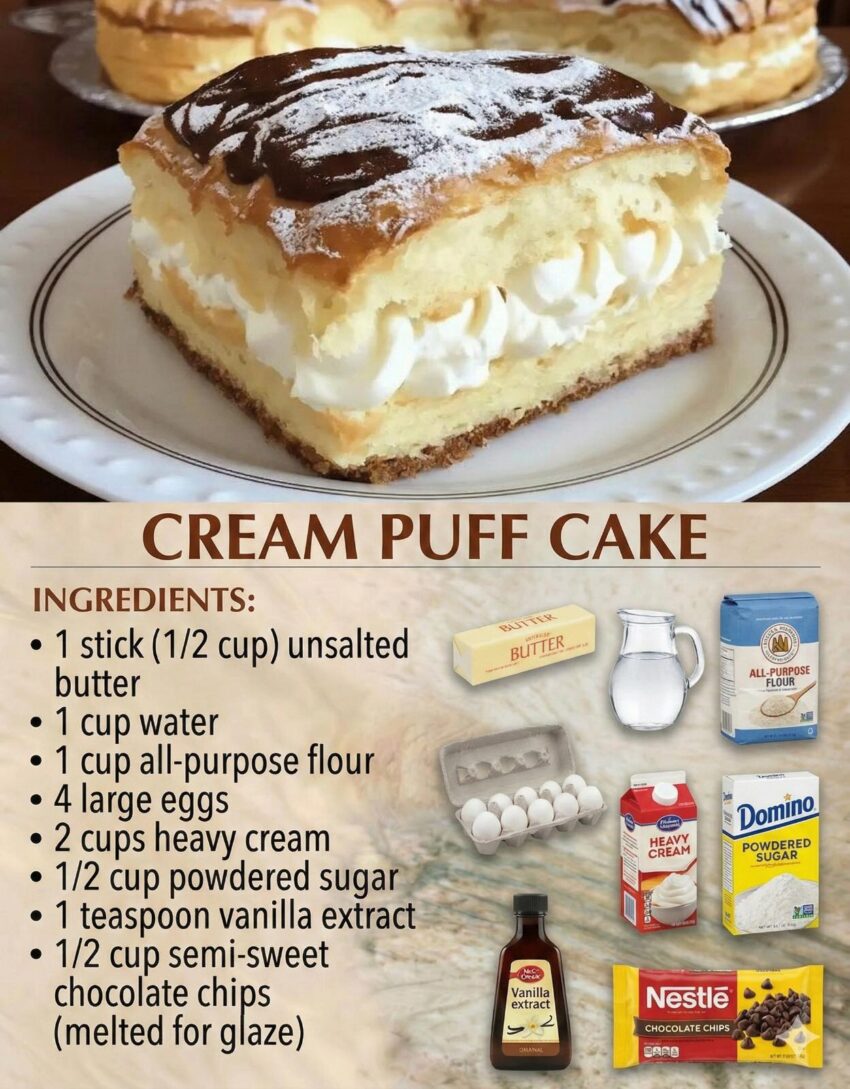 Here’s a delightful recipe for a Cream Puff Cake—essentially a sheet cake version of classic cream puffs, layered with custard and whipped cream. 🍰