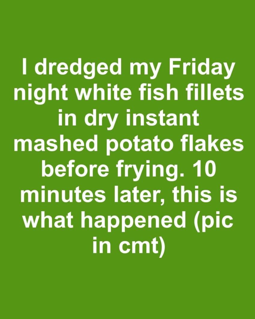That’s actually a clever shortcut technique—what you’re describing is basically using instant potato flakes as a crusting/breading agent for fish. What likely “happened” after 10 minutes depends on texture and moisture, but here’s what’s going on scientifically in the pan:
