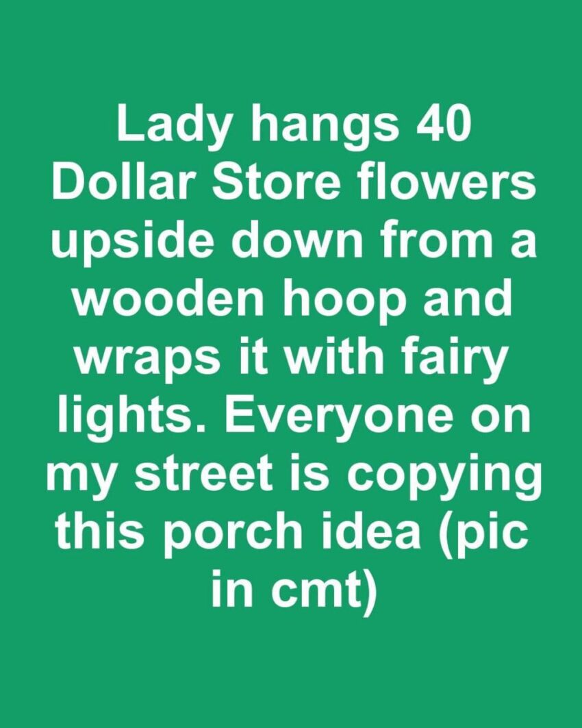 Lady hangs 40 Dollar Store flowers upside down from a wooden hoop and wraps it with fairy lights. Everyone on my street is copying this porch idea (pic in cmt)