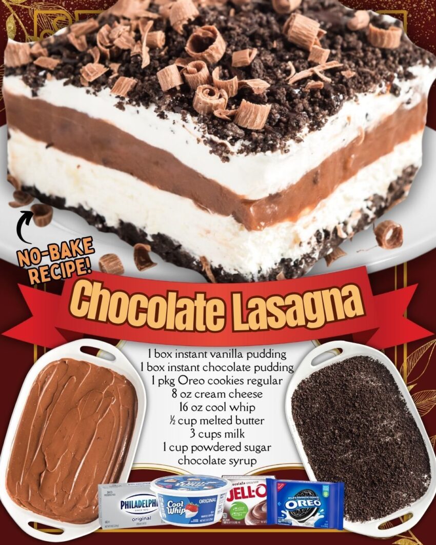 Here’s a rich, creamy No-Bake Chocolate Lasagna β€” layered, decadent, and perfect for parties 🍫