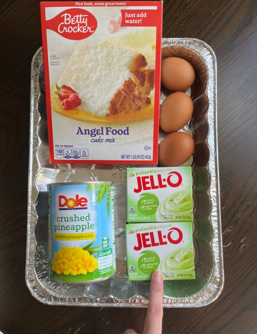 • In a large bowl, combine the cake mix, pistachio pudding mix, oil, eggs, and crushed pineapple with its juice.