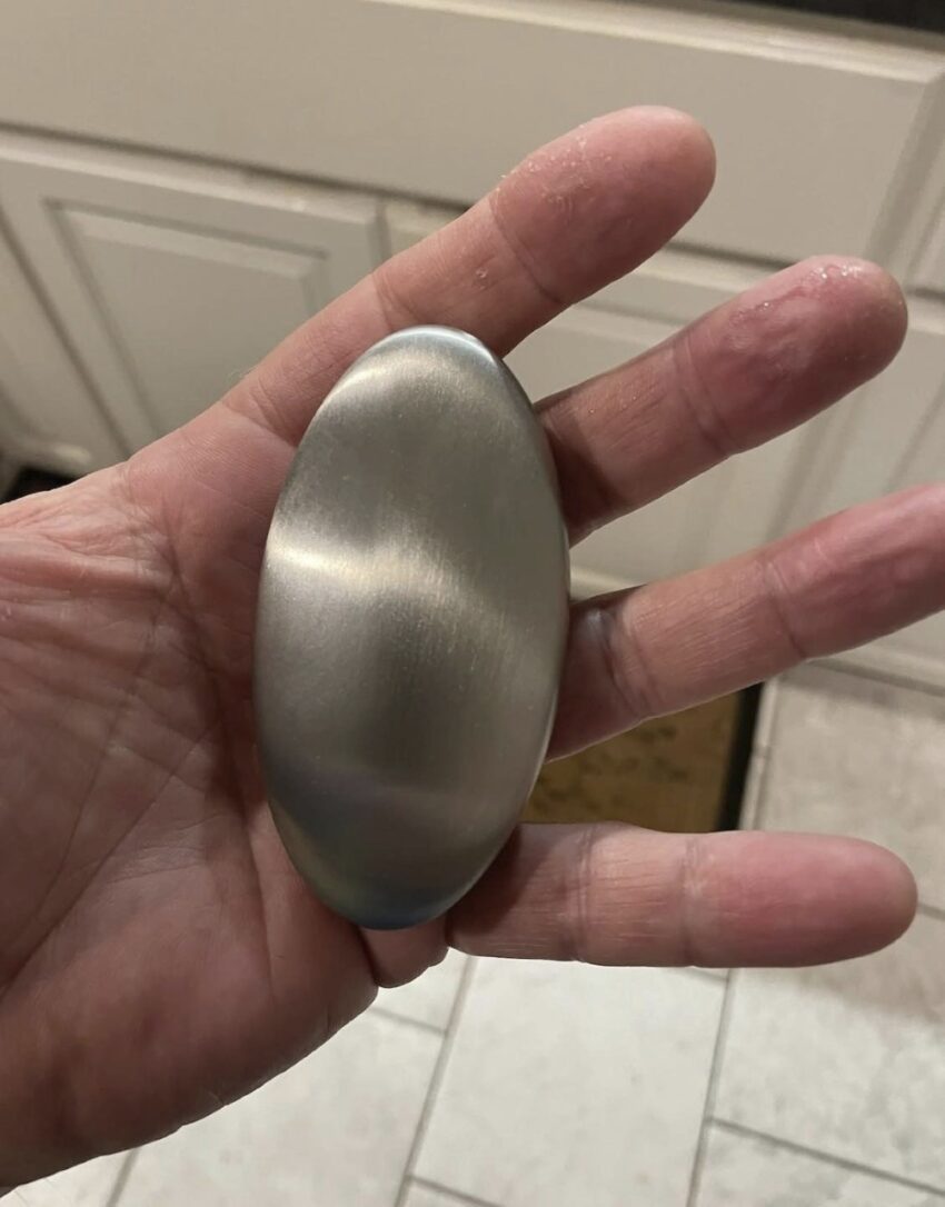 A stainless steel “bar soap” isn’t actually soap in the traditional sense—it’s usually a metal deodorizer block shaped like a soap bar.
