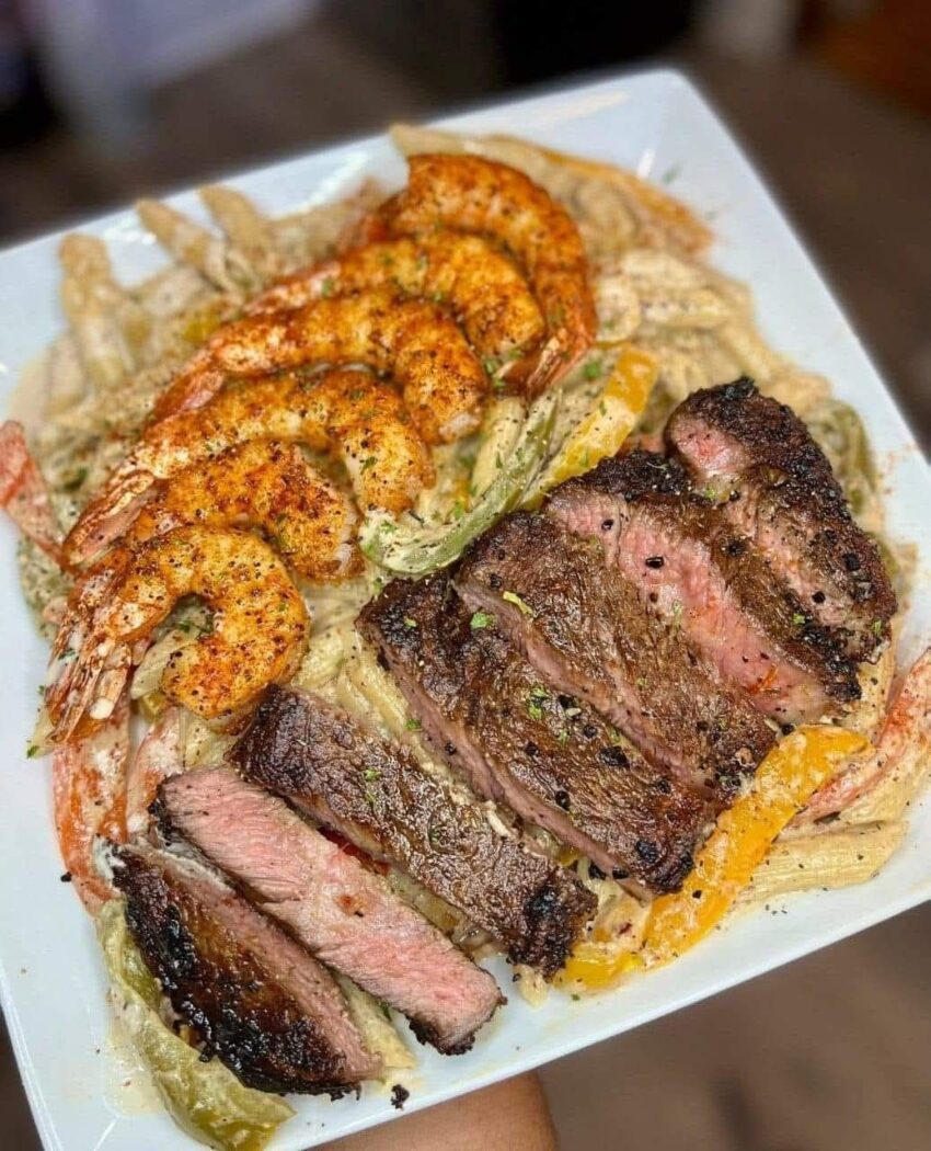 Here’s a flavorful recipe for Steak and Shrimp Jerk Pasta, combining tender steak, spicy jerk-seasoned shrimp, and a creamy pasta sauce: